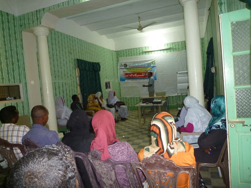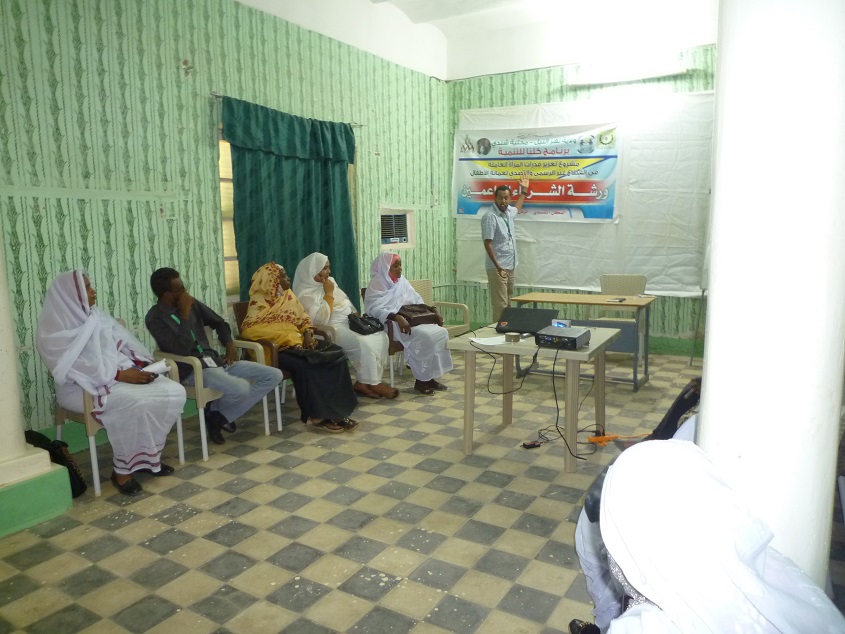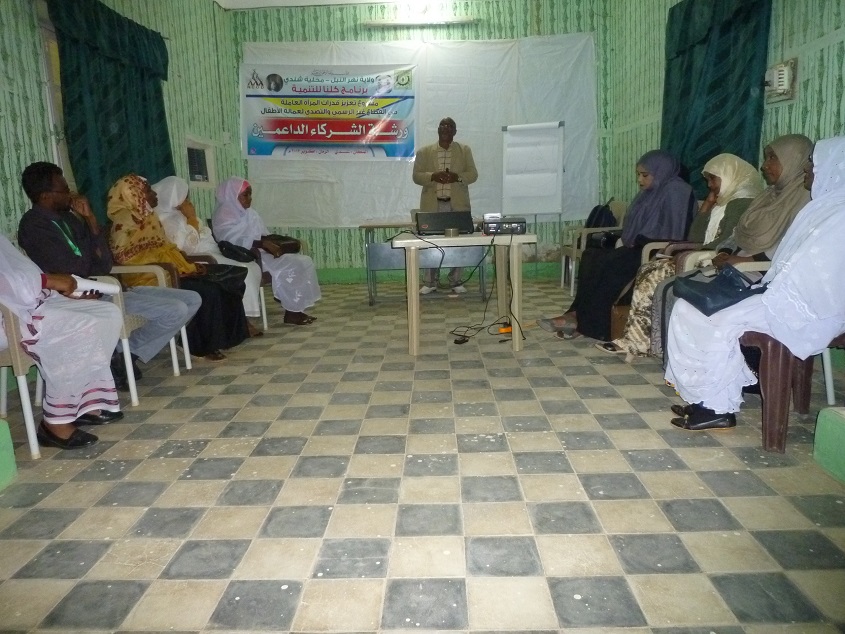 The workshop was attended by (15) individuals (7) women and (8) men representing; the Department of Social Affairs, Department of Women and Child, Council of Child Welfare, Department of Mental Health, and Director of Health Insurance in the locality, Diwan of Zakat, Shendi Textile Factory, Diwan of Endowments, Investment Department, Sudanese Telecom Company and a representative of women working in the informal sector.
