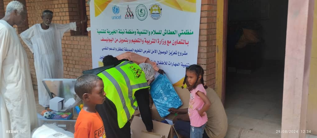 مواصله لتنفيذ انشطه مشروع تعزيز الوصول الامن لفرص التعليم الصديقه للطفل والدعم النفسي وتنميه المهارات للاطفال المتاثرين بالنزاع في سن المدرسه في ولايه نهر النيل قامت منظمه نبته الخيريه للتنميه وبالتعاون مع منظمه العطاش للسلام والتنميه وبتمويل من اليونيسف بتوزيع المعينات المدرسيه لعدد 51 مدرسه بمحليه الدار وذلك في شهر اغسطس 20 24